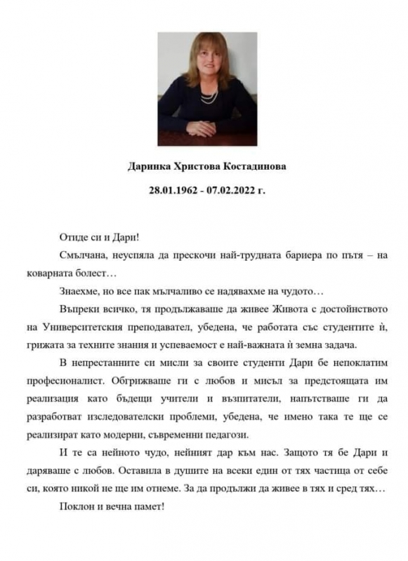 Днес, на 60 години, е издъхнала гл. ас. д-р Даринка Костадинова.