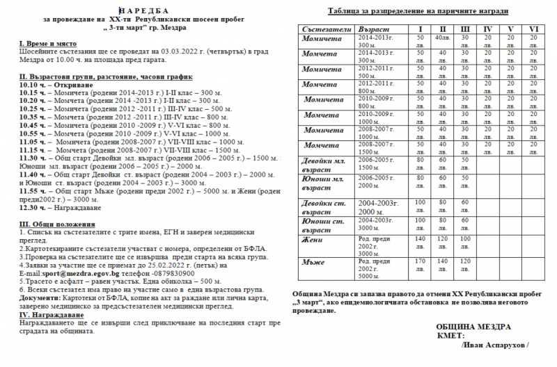 Наредбата за провеждане на шосейния пробег е качена на сайта на Община Мездра: https://www.mezdra.bg/