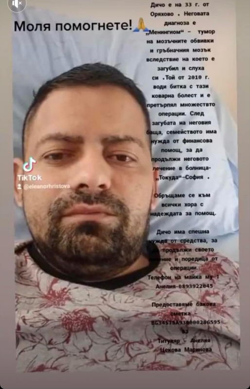 Дилян Борисов /Дичо/ е на 33 гoдини. Неговата диагноза е „Менингиом“ - тумор на мозъчните обвивки и гръбначния мозък, вследствие на което е загубил и слуха си. От 2010 г. той води битка с тази коварна болест и е претърпял множествто операции. След загубата на неговия баща, семейството му има нужда от финансова помощ, за да продължи лечението му в болница "Токуда" в София.