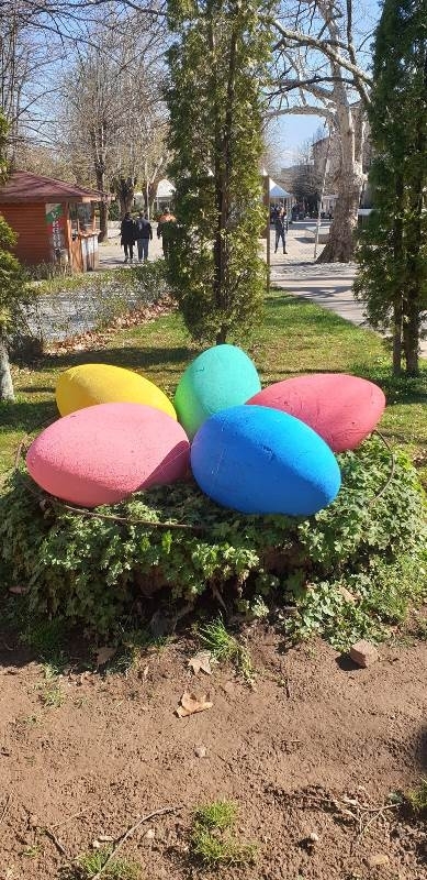 Шарени великденски яйца и приказни герои изникнаха в градинките и тревните площи в централната част. Много от хората вече си направиха страхотни снимки на фона на празничната украса.