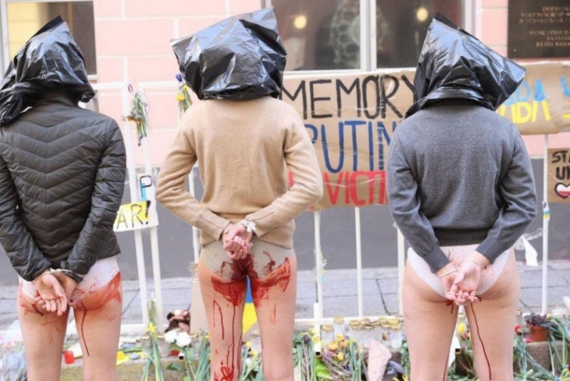 Група от жени протестираха пред руското посолство в Талин, Естония срещу жестокостите в Украйна и изнасилванията в окупираните градове.