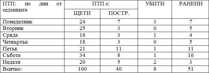 Анализът по дни от седмицата показва, че най-аварийният ден е събота, когато са настъпили общо 42 катастрофи с 1 загинал и 16 ранени граждани. В петък са станали 32 ПТП-та, като убит е един и са ранени 11 души, а в понеделник са настъпили общо 31 катастрофи с 3-ма убити и 7 пострадали.