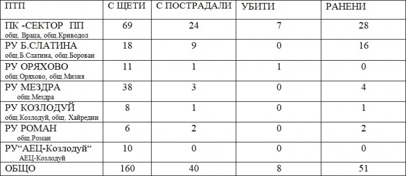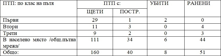 Данните на МВР показват, че най-много катастрофи са станали на територията на населените места от областта - 145 от всички 200 ПТП-та. В тях са намерили смъртта си 6-има от 8-те загинали, а 44 човека са ранени.
