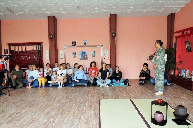 Преди същинската демонстрация Биляна Николова, която в момента е преподавател по чайна церемония в стил Урасенке в Японския културен център „Кокоро“ (Japanese Culture Center Kokoro) в София, запозна присъстващите с основните елементи, история и принципи на чайния ритуал. Тя разказа, че чайната церемония (чадо или садо) е ритуална подготовка и поднасяне на зелен прахообразен чай в присъствието на гости. Една пълна официална церемония включва хранене (чакайсеки) и два чая (коча и усуча) и трае около четири часа. В това време домакинът ангажира цялото си същество в създаването на подходяща обстановка, носеща естетична, интелектуална и физическа наслада и спокойствие на съзнанието на гостите. Идеята на чайната церемония идва от Дзен Будизма, да живееш единствено в настоящия момент, a целият ритуал е конструиран така, че да ангажира сетивата на човека, той да бъде изцяло въвлечен в церемонията и да се освободи от своето ежедневие.