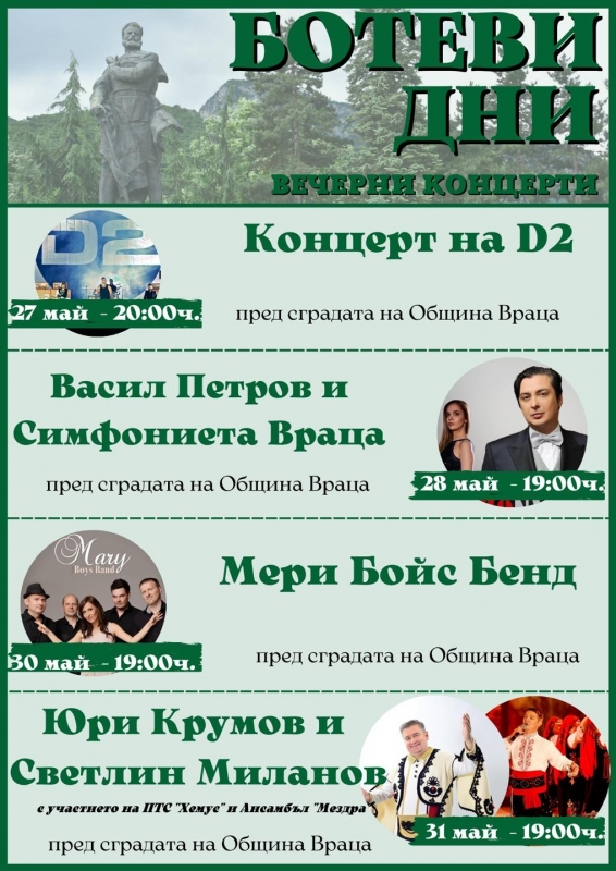 И тази година част от програмата на Ботеви дни ще бъдат вечерни концерти на открита сцена, съобщиа от общината във Враца.