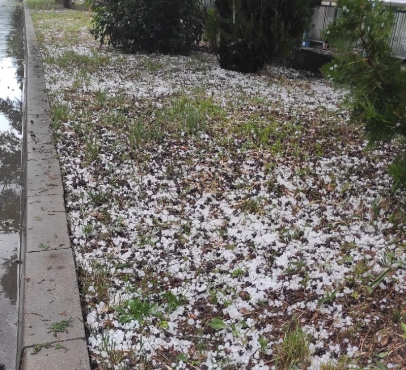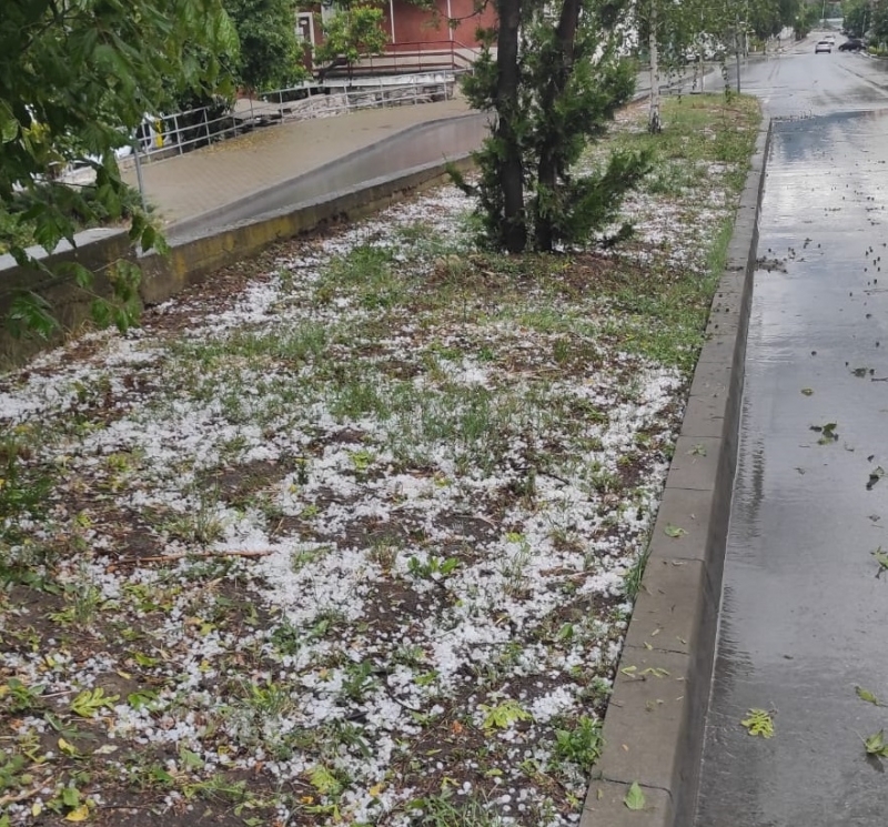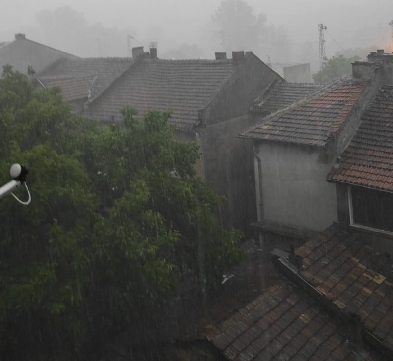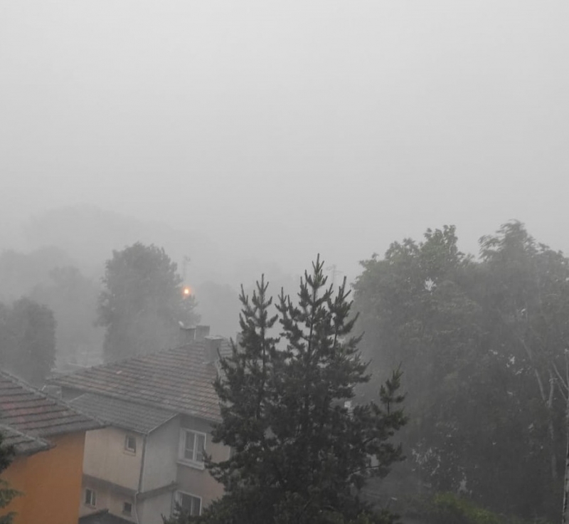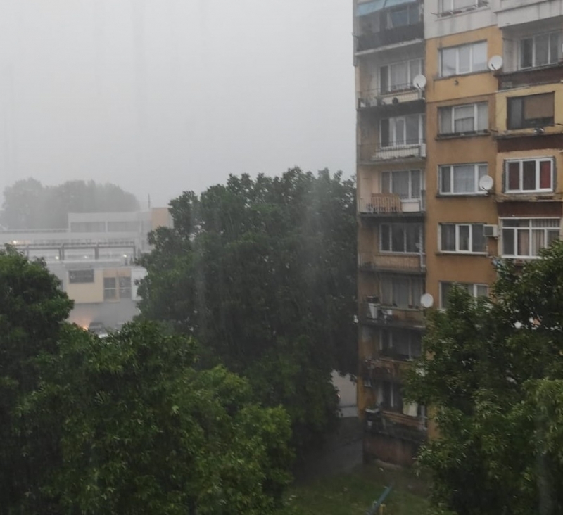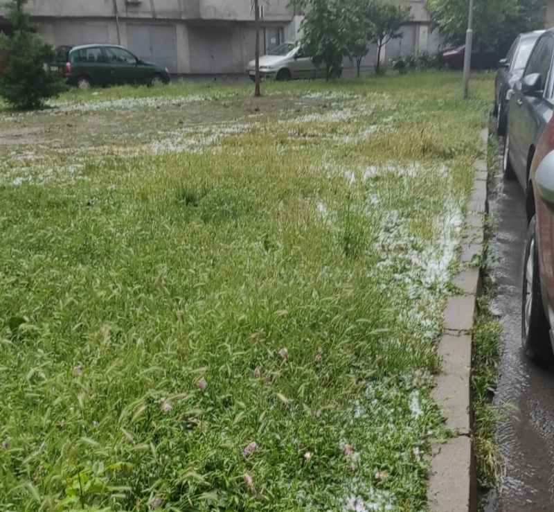 Повече от 30 минути продължава обилното изливане над града на небесна вода. През част от времето удари градушка колкото орех, която вероятно е нанесла щети на насаждения и леки автомобили.