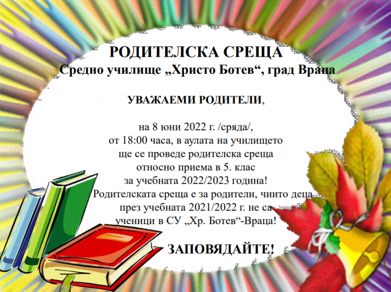 Уважаеми родители, от 20 юни 2022 г. /понеделник/ Средно училище „Христо Ботев“-Враца стартира онлайн система за подаване на заявления за прием в пети клас за учебната 2022/2023 година.