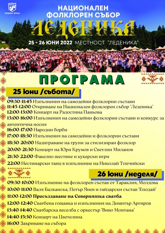 Готова е програмата за юбилейното издание на Национален фолклорен събор „Леденика“, съобщиха от община Враца.