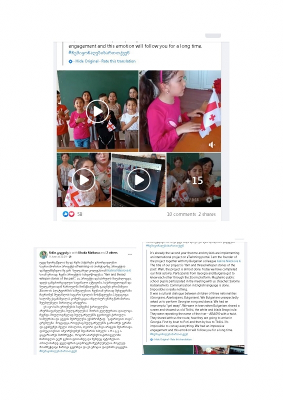 Тримата учители, осъществили онлайн срещата, Калина Николова, ръководител на проекта от българска страна, и Нино Цицвидзе и Саломе Катсанашвили от Грузия, изразиха удовлетворението си от работата на децата.
