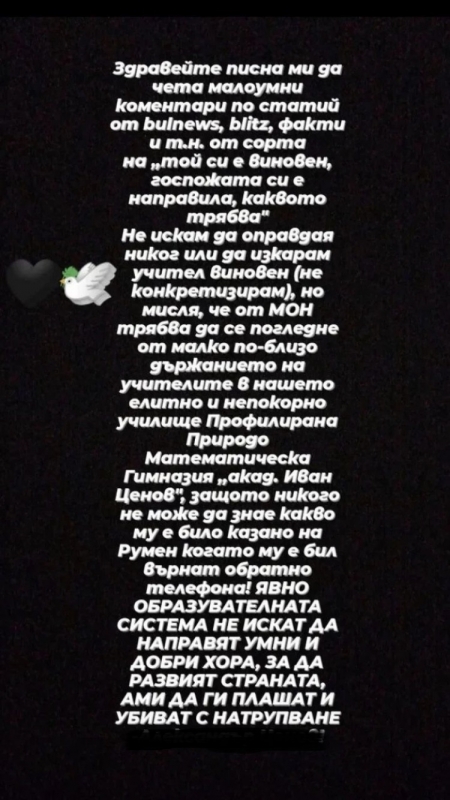 "Днес е тъжен ден за общността на ППМГ „Акад. Иван Ценов“. Загубихме наш ученик, съученик и приятел, за когото всички скърбим. Трагедията е огромна, защото винаги сме възприемали училището ни като едно своеобразно семейство, в което всеки е ценен. Затова молим една лична и семейна трагедия да не бъде използвана за търсене на евтина популярност.