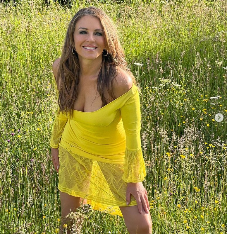 Преди няколко дни британската актриса сподели снимка, на която носи сексапилна искряща розова рокля на Versace с отворени участъци, които са съединени заедно с миниатюрни златни верижки. Кадрите, на които участва и синът ѝ Деймиън, бяха публикувани точно след като Хърли отбеляза 57-ия си рожден ден на 10 юни.