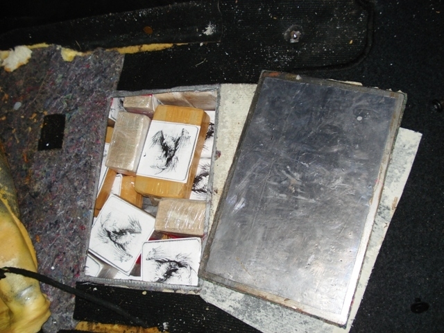 В него, зад сгънати сив и черен сак, са били открити множество бели пакети, опаковани с прозрачно тиксо със залепен върху тях хартиен етикет с черно графично лого на орел. Под шофьорската седалка митническите инспектори са открили още един тайник, пълен със същите бели пакети.