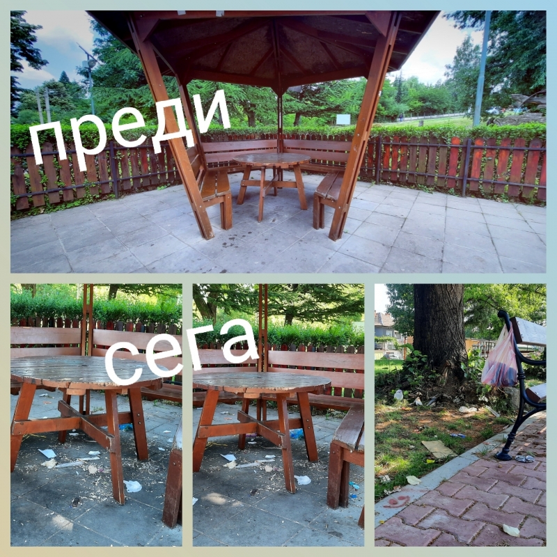 От администрацията споделиха снимки как е изглеждала беседката преди и след посещението на вандалите. На кадрите от неделя се виждат обелки от семки, смачкани кенчета, различни опаковки и други боклуци.