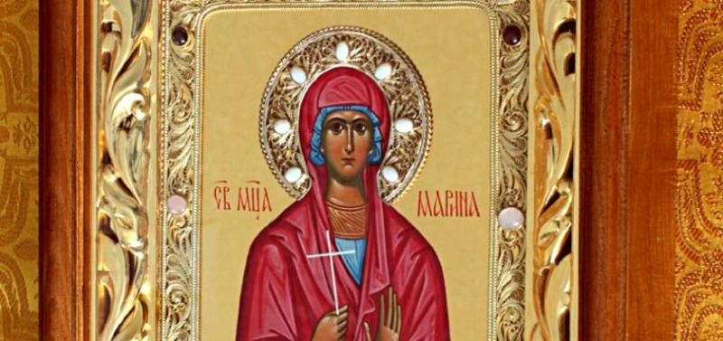 Света Великомъченица Марина се почита от Православната църква на 17 юли. Тя е известна сред католиците като Света Маргарита Антиохийска и се празнува на 20 юли, когато православните християни празнуват деня на Свети Илия. Житието на Света Марина е писано от епископ Теотимий и е ползвано за основа на множество преписи и преработки. Марина е живяла през III век и е била дъщеря на езически жрец в Антиохия Писидийска (Антиохия Цезарея). Въпреки възпитанието в идолопоклонничество, Марина прегръща христовата вяра на дванадесет годишна възраст, поради което баща ѝ започва да се отнася жестоко с нея, заради вярата, която тя открито изповядва. Когато навършила шестнадесет години, била срещната от управителят на източните страни Олибрий, който пленен от красотата ѝ, я харесва за своя жена. Тя не скрила от него че изповядва христовата вяра, а той заповядал да я арестуват и на следващия ден я изправил на съд. Марина не била съблазнена от обещанията за охолен живот и прекършена от мъченията, за да се откаже от вярата си. Тялото ѝ било разранено от мъченията, след което била прикована отново към дърво и терзана. През нощта в тъмницата, Марина се молила горещо на Бога. Появил се светещ кръст и тя чула глас, който ѝ обещал, че скоро ще се представи в чертога на своя небесен жених. Раните ѝ оздравявали. Тя помолила Бог да ѝ даде свето кръщение, преди да умре. На следващия ден, когато отново била изправена пред съда, девойката удивила всички с цветущия си вид. Онези, които я видели, отдали чудото на Бога. Марина потвърдила непоколебимостта на вярата си в Христа. Тя била подложена отново на мъчения, тялото ѝ било разранено, а раните опалени с огън, но Марина непрекъснато молила Бога да я дари със свето кръщение. Това накарало Олибрий да нареди да я удавят. Марина била добре вързана и хвърлена в дълбока каца с вода. Молитвите на девицата били чути от Христа и оковите по чудо паднали, а тя изправена във водата запяла хвалебствени песни към него. Управителят Олибрий заповядал да я изведат извън града и да я посекат с меч. Това се случило в четвъртата година от царуването на Диоклециан – през 289 година. В житиетата на Света Марина впоследствие се появява и епизод, който разказва, че по време на мъченията, в тъмницата ѝ се появил дявола под формата на огромен дракон обвит със змии, който заплашил да я разкъса и погълне. Девицата Марина го прогонила с кръстен знак. По-късните версии на този епизод стават дори още по-драматични – дяволът погълнал девойката, а тя с кръстен знак го принудила да отвори пастта си и тя излязла от търбуха му жива и здрава. В други версии пресонификацията на дявола се задавил и се пръснал, а Марина остава жива и здрава; Марина разпаря корема на дракона с кръст, който държи в ръката си. Трета версия, в която дяволът, веднъж победен като дракон, се появява като тромав космат мъж, който заплашва отново Марина, но тя го прогонва с кръстен знак. В по-късни версии на житието на светицата се разказва, че тя от малка останала сираче и за нейна дойка била наета селянка от околността на Антиохия, която била християнка и въвела Марина в християнството. Други текстове, използвани от Православната църква, споменават че дванадесет годишната Марина приема християнската вяра от скитащ просяк – християнин.