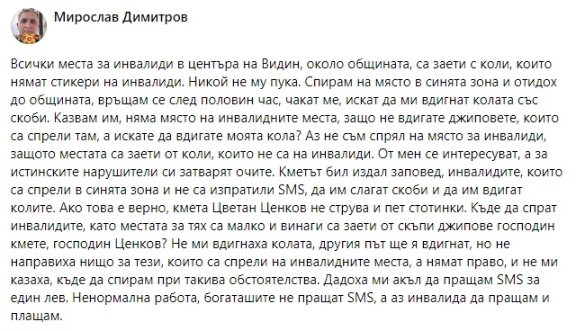 Преди няколко дни мъжът имал работа в общината и след като видял, че няма къде да спре на инвалидно място, той паркирал на синя зона. Когато се върнал след половин час заварил служители на общината, които се готвели да му вдигнат колата. Когато Димитров им обяснил, че не е имало къде да спре и вместо да санкционират него, да санкционират нарушителите, спрели на инвалидните места, те му казали следващия път да пусне SMS.
