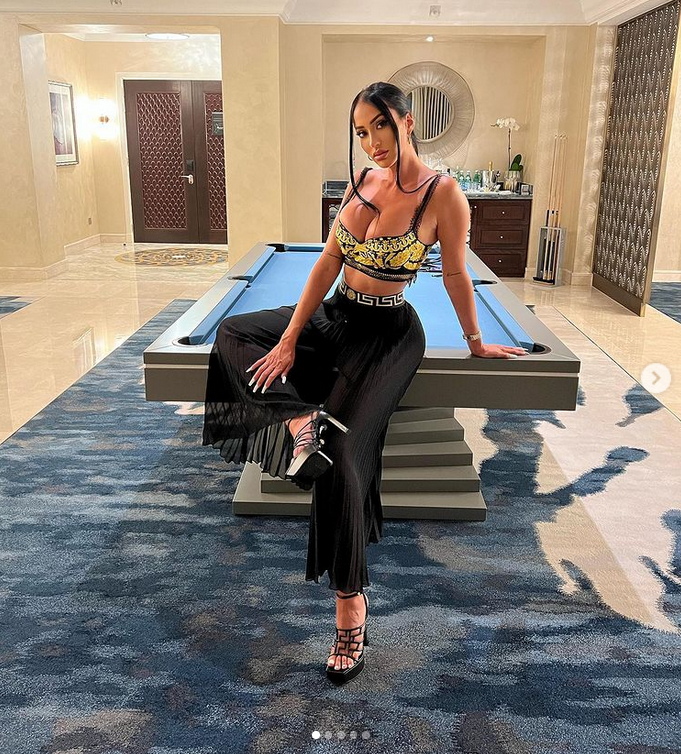Красавицата, която се омъжи за бившия нападател на "Реал4 /Мадрид/ и ПСЖ - Хесе Родригес, се пусна върху билярдна маса по бюстие, което едва скриваше огромните ѝ гърди.