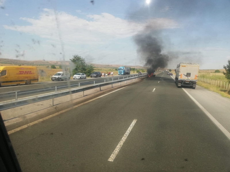 Екипи на пожарната от Сливен и Нова Загора пътуват към мястото на инцидента. Трафикът се осъществява по обходен маршрут от пътен възел "Нова Загора" – Сливен – АМ "Тракия".