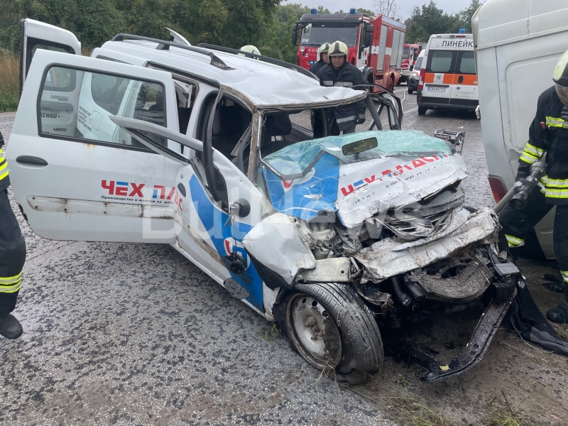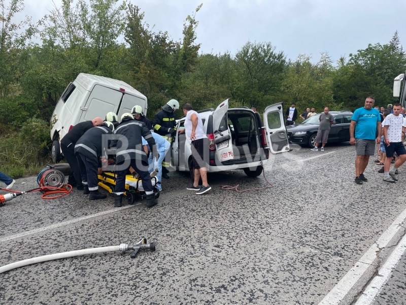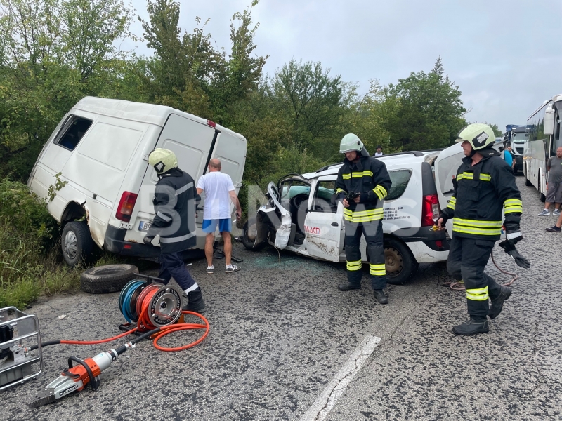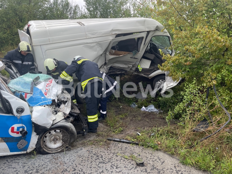 Ударът е бил толкова силен, че цялата дясна страна на буса е смачкана, а той е изхвърчал край пътя. От силния сблъсък леката кола е останала без предница.