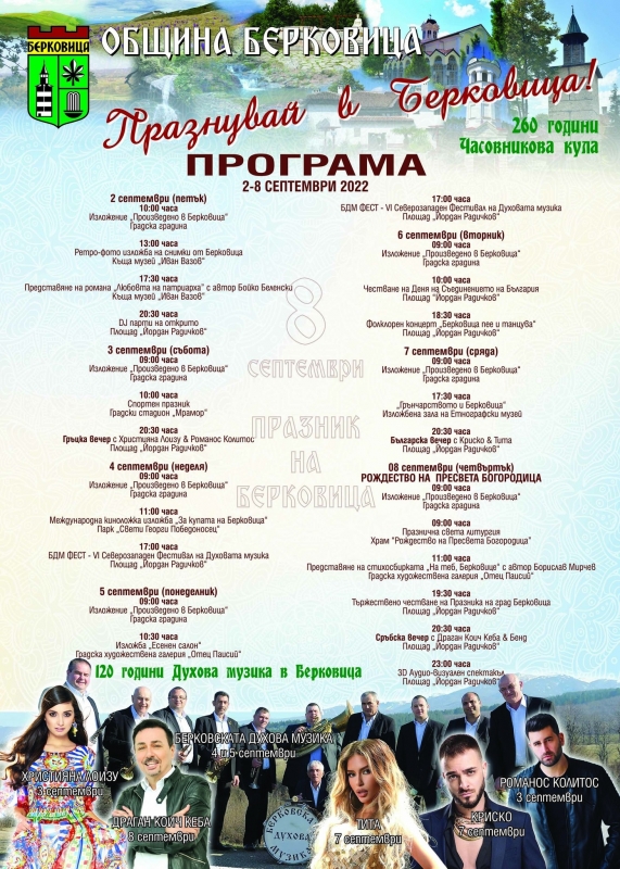 Очакват ви вълнуващи моменти с познати имена от музикалната сцена, тематични музикални вечери с любими гръцки, български и сръбски изпълнители, 6-и Северозападен Фестивал на Духовата музика и оркестри, които ще ви смаят с маратон по надсвирване, фолклорен концерт, изложби, представяне на книги, международна киноложка изложба, представяне на филм за най-възрастния берковски грънчар, изложение на местни занаятчии, 3D Aудио-визуален спектакъл.