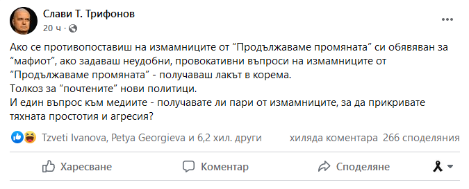 Лидерът на "Има такъв народ" Слави Трифонов отправи нова критика към "Продължаваме промяната". Този път отново в социалната мрежа.
