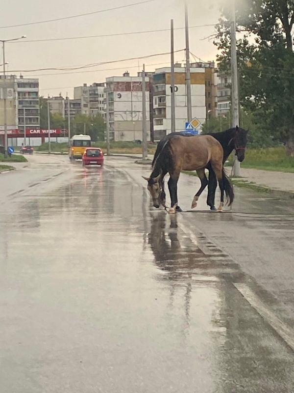 Жителка на града е заснела два коня на бул. "Панония" и е качила снимките в социалната мрежа, за да предупреди съгражданите си да внимават. На един от кадрите на авторката на поста Гергана Георгиева се вижда как животните са се изправили на задните си копита и сякаш танцуват насред булеварда посред бял ден.