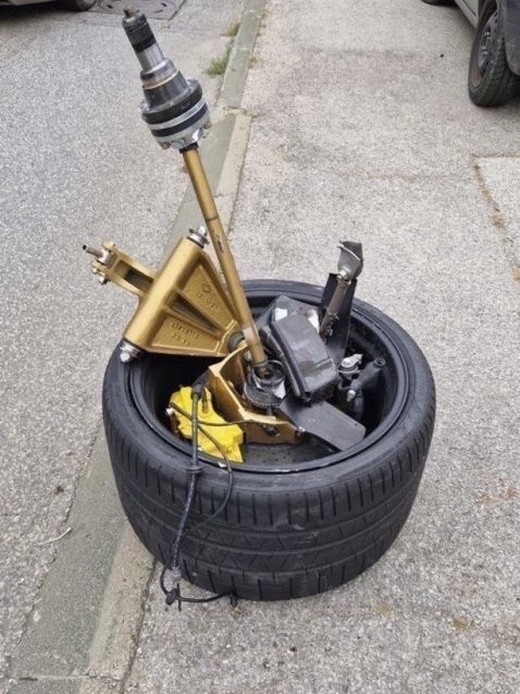 Спортната кола е със сериозно повредена задница - изкъртено колело, липсват светлини и част от калника. Вижда се още, че се е ударила в предния калник. Ремонтът на аеродинамичните повърхности от въглеродни влакна ще бъде много скъп.