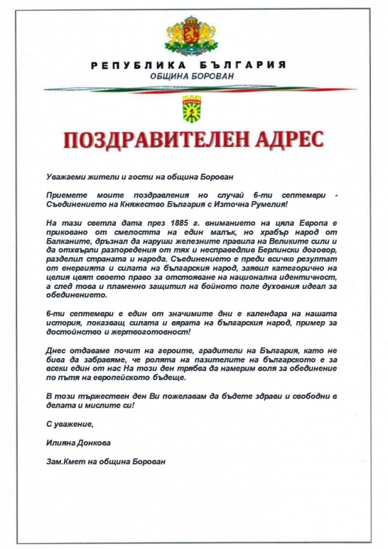 Oт Община Борован излязоха с поздрав по случай Деня на Съединението - 6 септември.