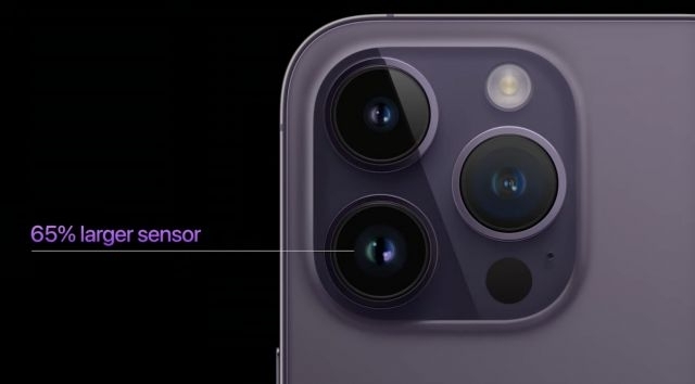 Основната камера е с нов 48MP 24мм сензор с нова технология и 65% по-голям сензор от този при предходния модел. Сензорът позволява навлизането на повече светлина и може да комбинира 4 пиксела в един, за да позволи до 2 пъти по-добри снимки при ниска осветеност в сравнение с iPhone 13 Pro. Apple добавя оптична дължина с 2-кратно увеличение благодарение на новия сензор. Нов е и сензорът на ултрашироката камера с 12MP резолюция и 13мм фокусно разстояние. Както и всяка година, новият iPhone Pro предлага най-добрата система от камери поставяна някога в iPhone до момента.