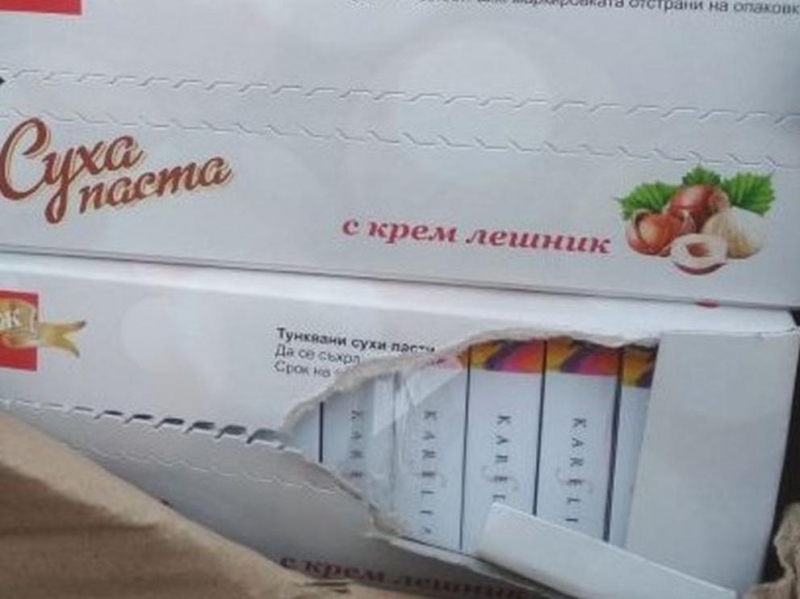 При извършена проверка митническите служители установяват, че вместо сухи пасти в кутиите има цигари, облепени с български акцизен бандерол.