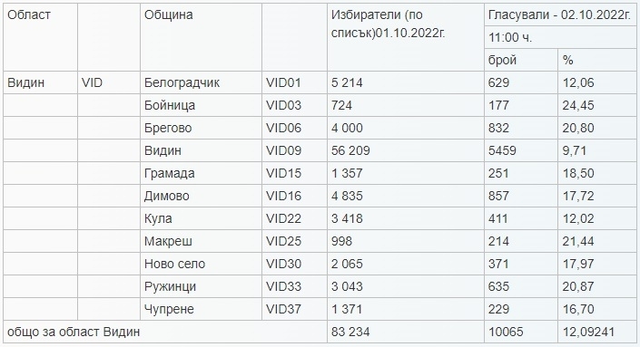 Малко над 12% е избирателната активност в област Видин, сочат данните на районната избирателна комисия.
