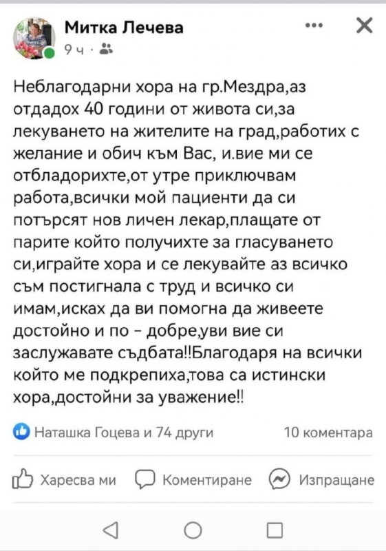 В публикацията тя нарича пациентите си "неблагодарни хора", като ги приканва да си намерят друг лекар, защото желае да прекъсне дейността си. Също така ги обвинява, че са продали гласа си и ги праща да плащат за лекарски грижи с парите, които са получили, за да гласуват.