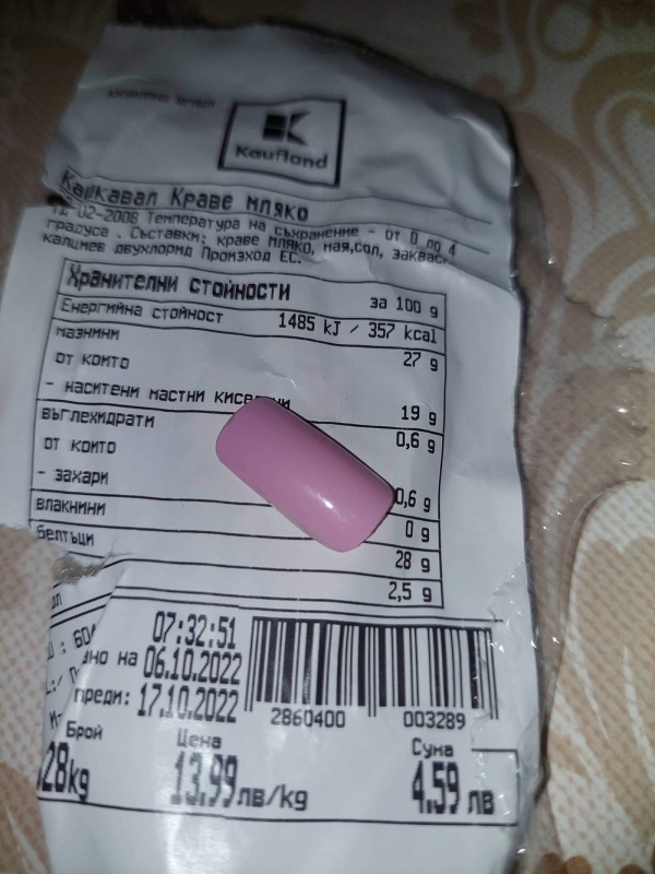 Гнусна находка! Клиентка на "Кауфланд" във Враца си купи кашкавал с бонус нокът /снимки/