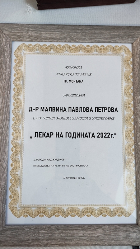 Отличие за професионализъм получи и доктор Малвина Павлова – Управител на „Медицински център 1“ в Берковица. Доктор Павлова е лекар-специалист вътрешни болести с над 30 години стаж.