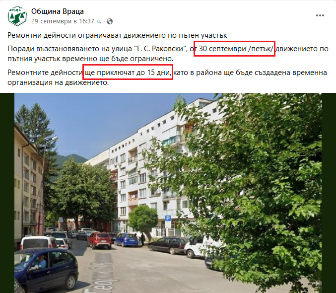 На 29 септември от община Враца официално съобщиха, че на следващия ден ще бъде затворена възловата улица „Г.С. Раковски“ за основен ремонт. Според графика тя трябваше да стане готова до 15 дни, което означаваше на 15 октомври шофьорите да могат вече спокойно да минават по нея.