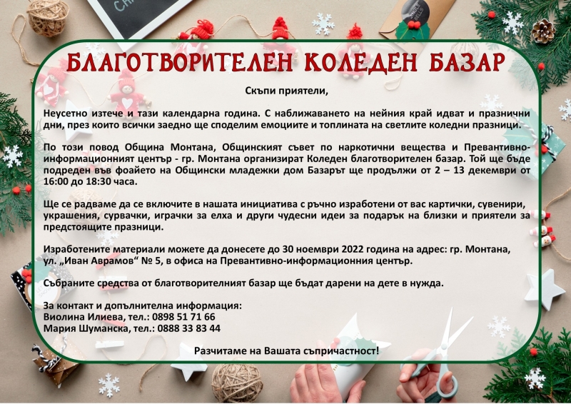 Община Монтана, Общински съвет по наркотични вещества и Превантивно-информационният център в града организират Коледен благотворителен базар, научи агенция BulNews.