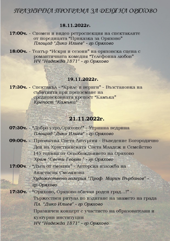 Община Оряхово е готова с програмата, с която ще бъде отбелязан празника на града. По традиция той се чества на 21 ноември, когато е неговото освобождение от турско робство. Проявите обаче ще започнат още на 18-и и ще продължат цели три дни.