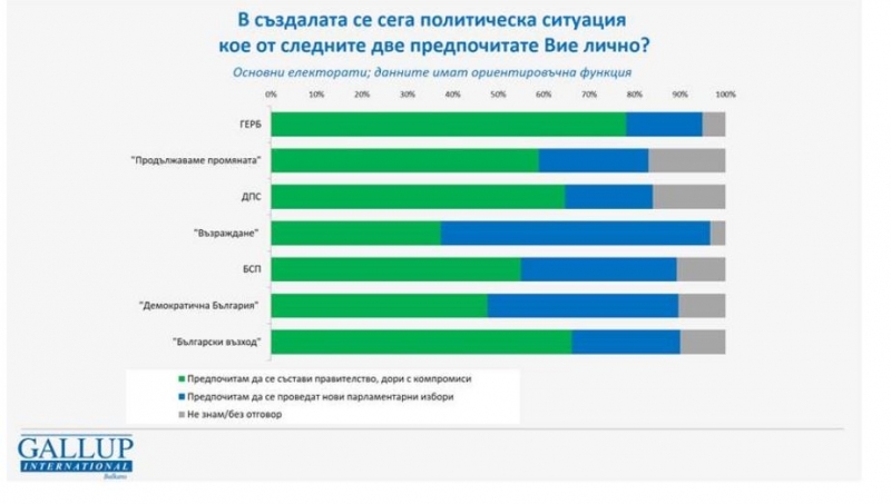 56% от запитаните избират опцията „Предпочитам да се състави правителство, дори с компромиси“, пред 26,7%, които избират „Предпочитам да се проведат нови парламентарни избори“. Останалите не могат да отговорят.