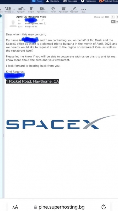 От първоначалния пост на ресторант ONÀ във Фейсбук се вижда, че човек, който се представя за част от екипа на Мъск, е изпратил брандирано със SpaceX писмо за потвърждение до електронната поща. Странното е, че от ресторанта се иска съдействието за визитата на Мъск, а не от правителството, каквато официално покана получи от служебния министър на туризма Илин Димитров.