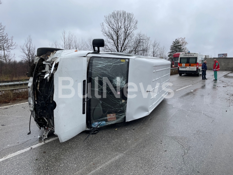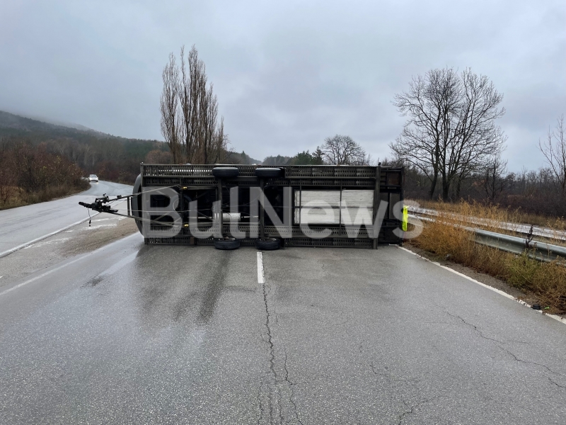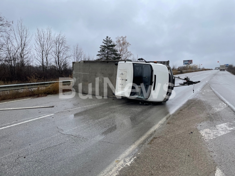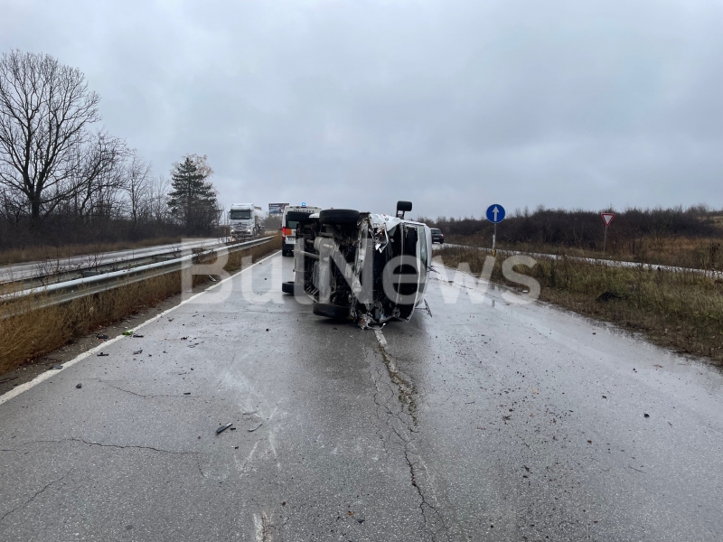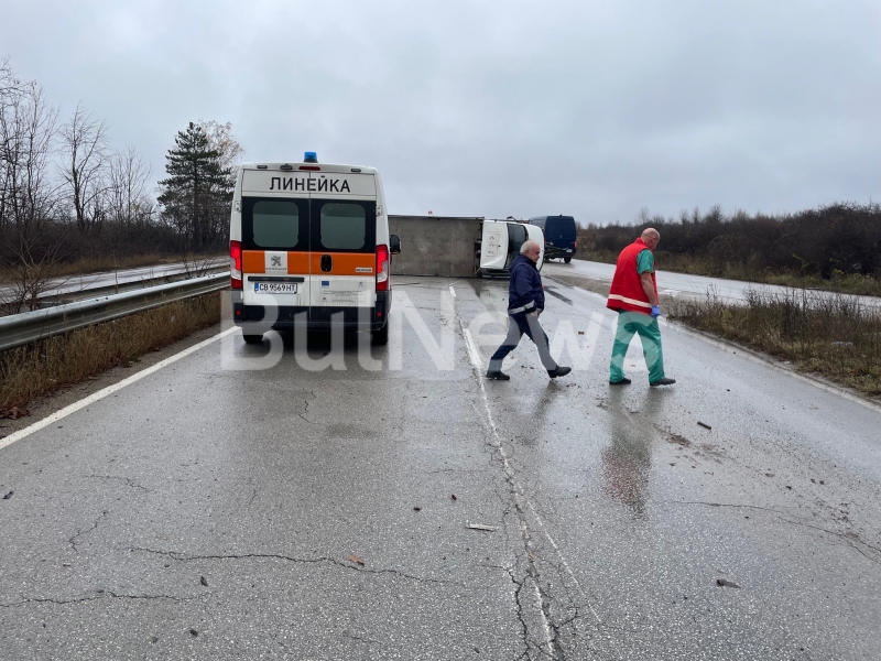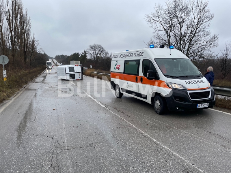 Бус с платформа се е обърнал на мокрия асфалт по натоварената отсечка от международния път.