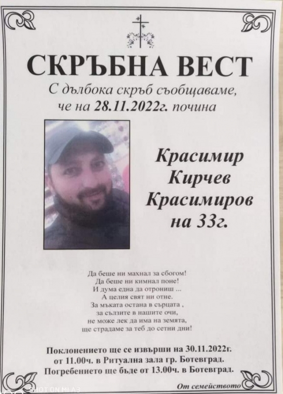 Поклонението ще бъде днес, от 11 часа, в Ритуалната зала в Ботевград, а погребението от 13 часа.