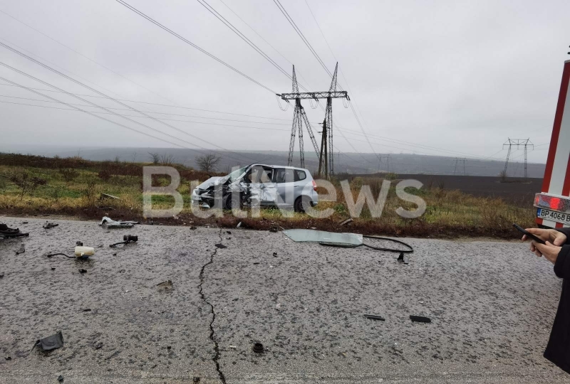 Возилата, участващи в произшествието, са със сериозни материални щети, а по пътното платно има разпилени от удара части.