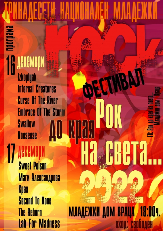 На 16 и 17 декември в голяма зала на Младежки дом - Враца ще се проведе тринадесетото издание на младежки рок фестивал „Рок до края на света“. Целта на събитието е да се даде поле за изява на млади рок и метъл групи. Участие във фестивала ще вземат следните групи: