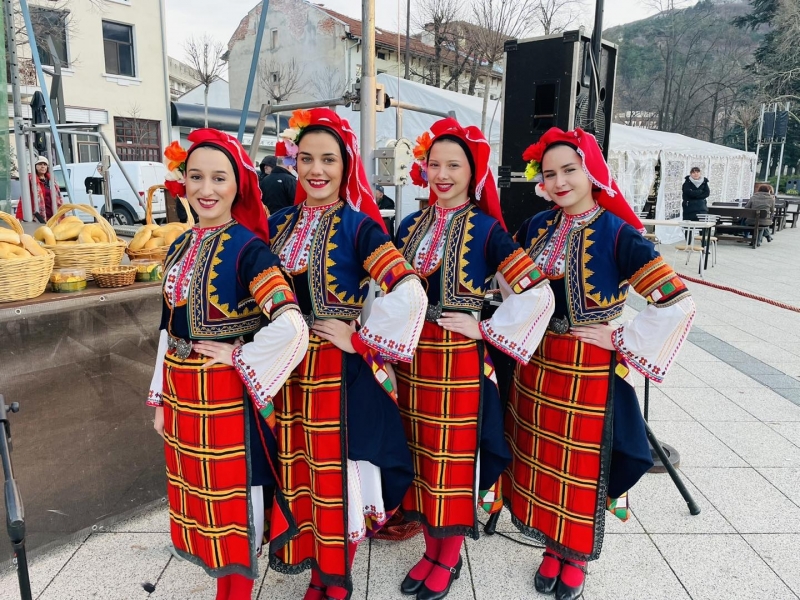 Пъстрата колона се отправи към централния площад, където възпитаниците на ДГ „Славейче“ и СУ „Васил Кънчов“ изпълниха народния обичай.