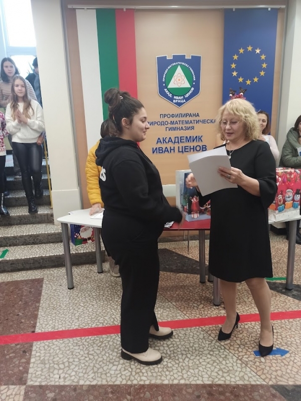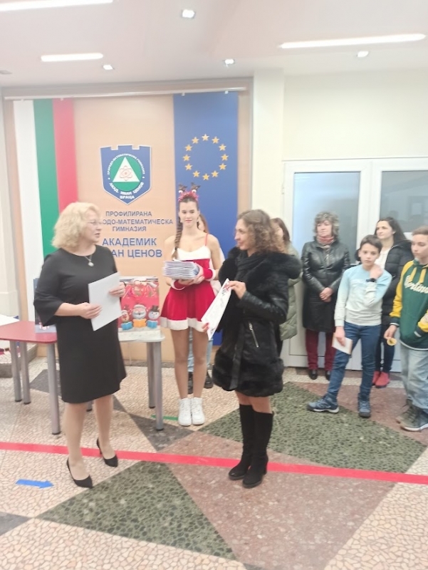 Наградиха победителите в два конкурса, организирани от ППМГ „Акад. Иван Ценов“, в навечерието на Коледните и Новогодишни празници – за най-красив коледен венец и най-интересно украсена врата на класна стая. Най-добрите бяха определени от комисия, съставена от учители и представители на Ученическия съвет към гимназията. Отличията връчи директора г-жа Татяна Василева.