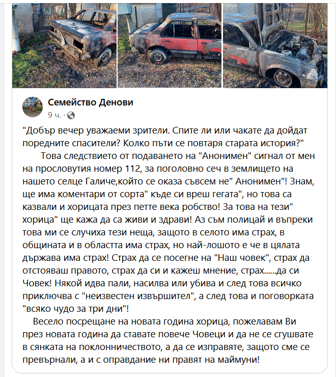 „Добър вечер уважаеми зрители. Спите ли или чакате да дойдат поредните спасители? Колко пъти се повтаря старата история?”, написа в профила си във фейсбук полицаят от РУ на АЕЦ „Козлодуй” Пламен Денов, чиято кола бе подпалена умишлено и изгоря напълно вчера през нощта пред дома му във врачанското село Галиче.