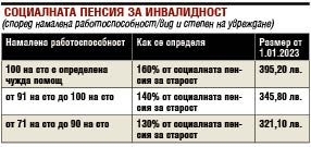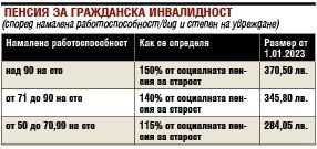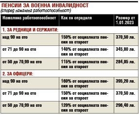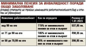 Минималната наследствена пенсия, както и минималните пенсии за инвалидност поради трудова злополука или общо заболяване, се определят като процент от минималната пенсия. Затова дали ще бъдат увеличени през 2023 г. трябва да реши парламентът. Само социалната пенсия за старост може да бъде увеличена с решение на Министерски съвет. Ако тя бъде увеличена от 1 юли с 12%, ще нарасне от сегашните 247 лв. на 276,64 лв. Това би довело до увеличение и на пенсиите за военна и гражданска инвалидност. Но нов бюджет на НОИ не беше приет, а само беше удължено действието на бюджета за 2022 г. Затова следващо редовно правителство трябва да реши дали да увеличи социалната пенсия за старост.