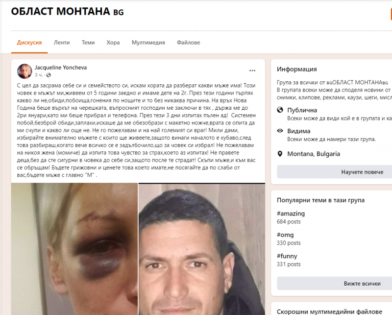 Жаклин Йончева е на 32 години и е родом от монтанското село Дълги дел. Преди 5 години започнала връзка с 35-годишния Красимир Велчев от Владимирово, който е от ромски произход. В началото всичко вървяло добре, тя се преместила при него, заедно с детето си, което имала от предишна връзка, и двамата се разбирали. Но за кратко. Мъжът започнал да проявява лошия си характер и системно сипел обиди и заплахи срещу Жаклин.
