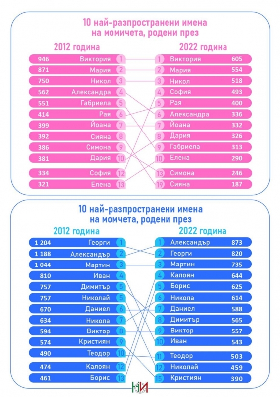 В инфографиката на НСИ се съдържа и класация Топ 10 на най-използваните имена за бебета през 2012 година и 2022 година.