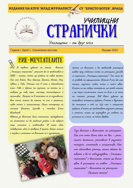 Амбицията на клуб „Млад журналист“ е да привлече нови съмишленици, заредени със същия ентусиазъм като тях, да разширят рубриките и екипа. „Училищни странички“ ще излиза всеки месец и ще се публикува на сайта училището.