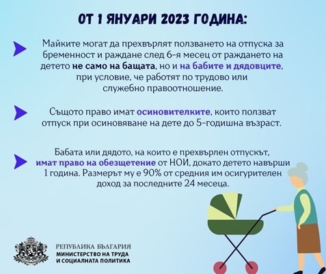 От 1 януари майките вече могат да прехвърлят ползването на отпуска за бременност и раждане след шестия месец от раждането на детето на бабите и дядовците. Условието обаче и те работят по трудово или служебно правоотношение. Досега то можеше да се прехвърля само на татковците.
